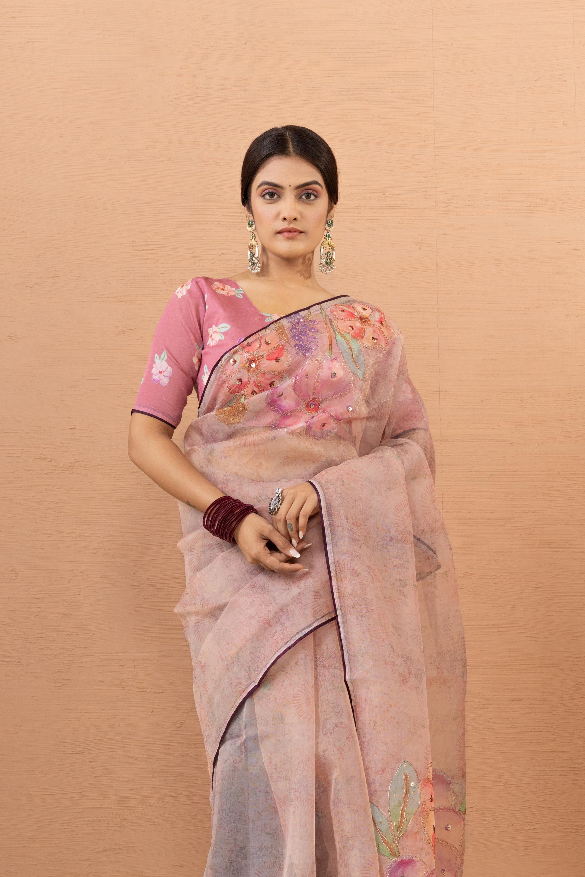Embrace soft romanticism with the Blush Bloom Organza saree, a delicate masterpiece designed for the modern dreamer. This saree is crafted from premium, ultra-lightweight organza, offering a crisp yet fluid drape and a subtle crystalline sheen. The fabric serves as a canvas for oversized, hand-painted floral motifs in shades of rose, lavender, and mint green, each highlighted with fine sequin work for a gentle shimmer. Finished with a slender plum-toned piping, this saree is an enchanting choice for garden weddings, festive high-teas, or elegant daytime celebrations.
