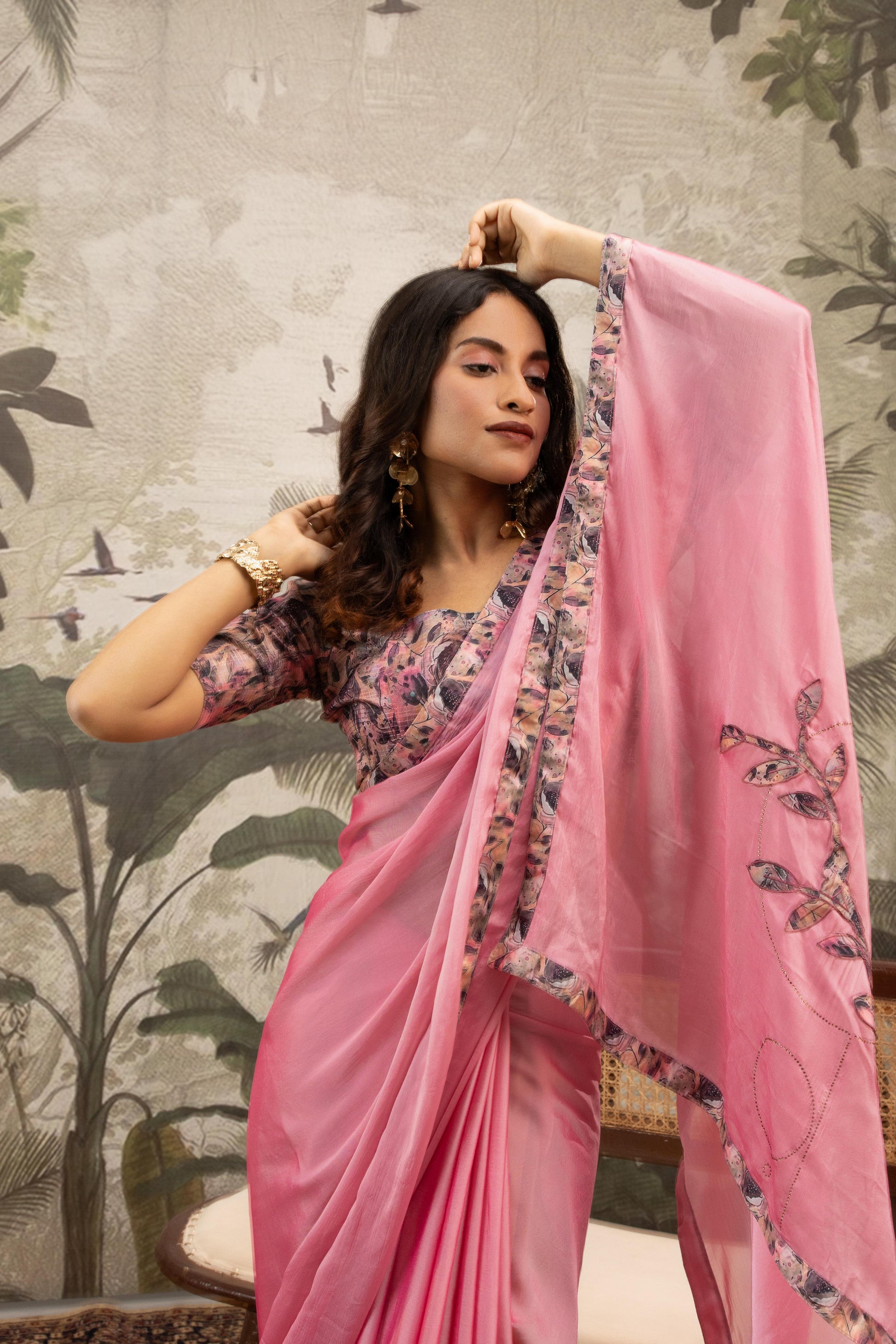 Design: Features minimalist hand-embroidered leaf and stem motifs on the pallu and a coordinated floral-print piping along the edges; paired with a matching blouse featuring an all-over botanical print and a flattering scoop neckline.