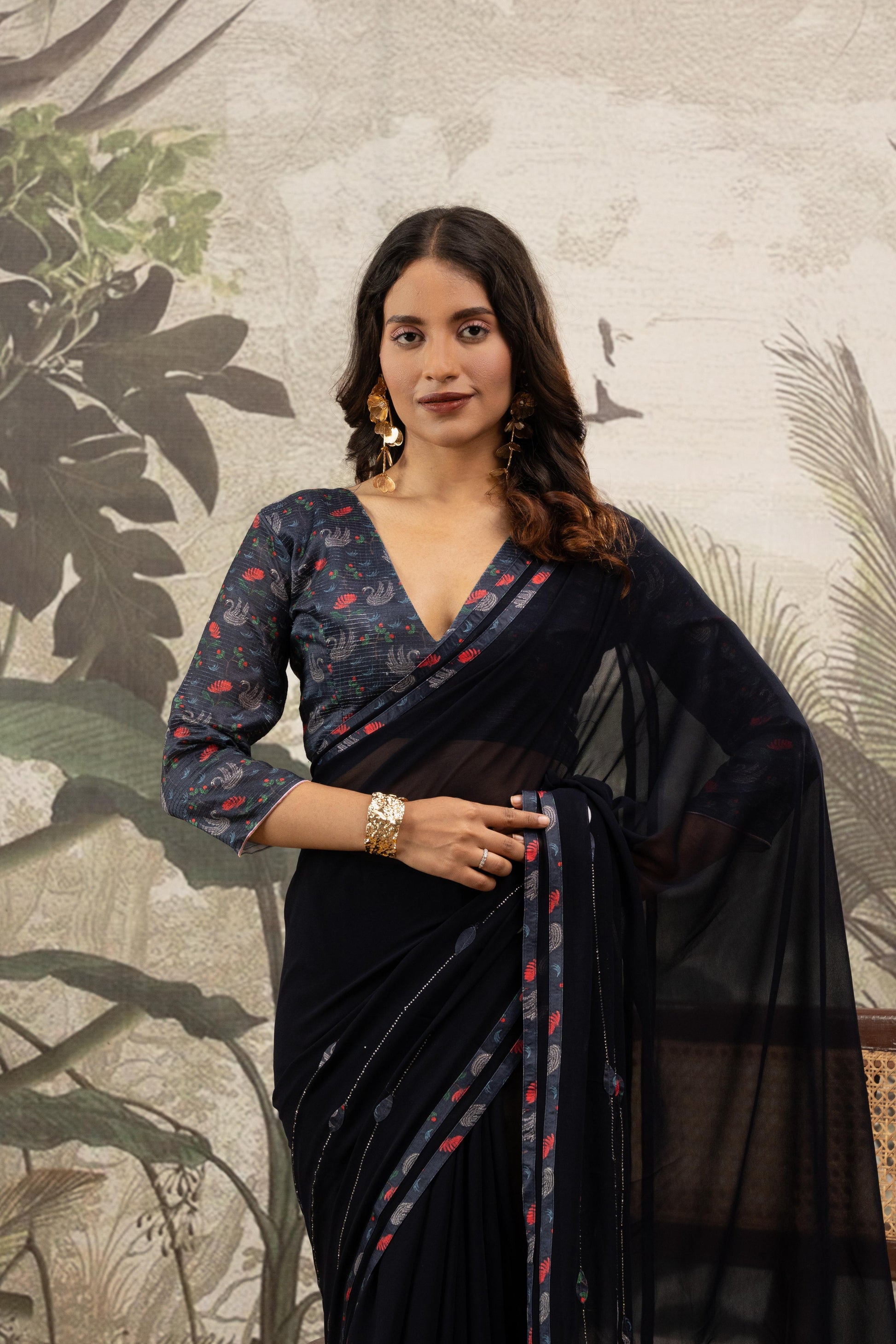 Step into the night with effortless allure in this Midnight Indigo Artisan saree. Crafted from premium georgette, the fabric offers a diaphanous quality and a sleek, liquid-like drape that enhances every movement. The deep indigo base is subtly elevated by shimmering vertical linear accents that elongate the silhouette, while a vibrant floral-print piping defines the edges. Paired with a deep-V neck floral blouse featuring intricate botanical patterns, this ensemble is a masterclass in modern evening elegance—perfect for cocktail soirées, reception dinners, or high-fashion events.