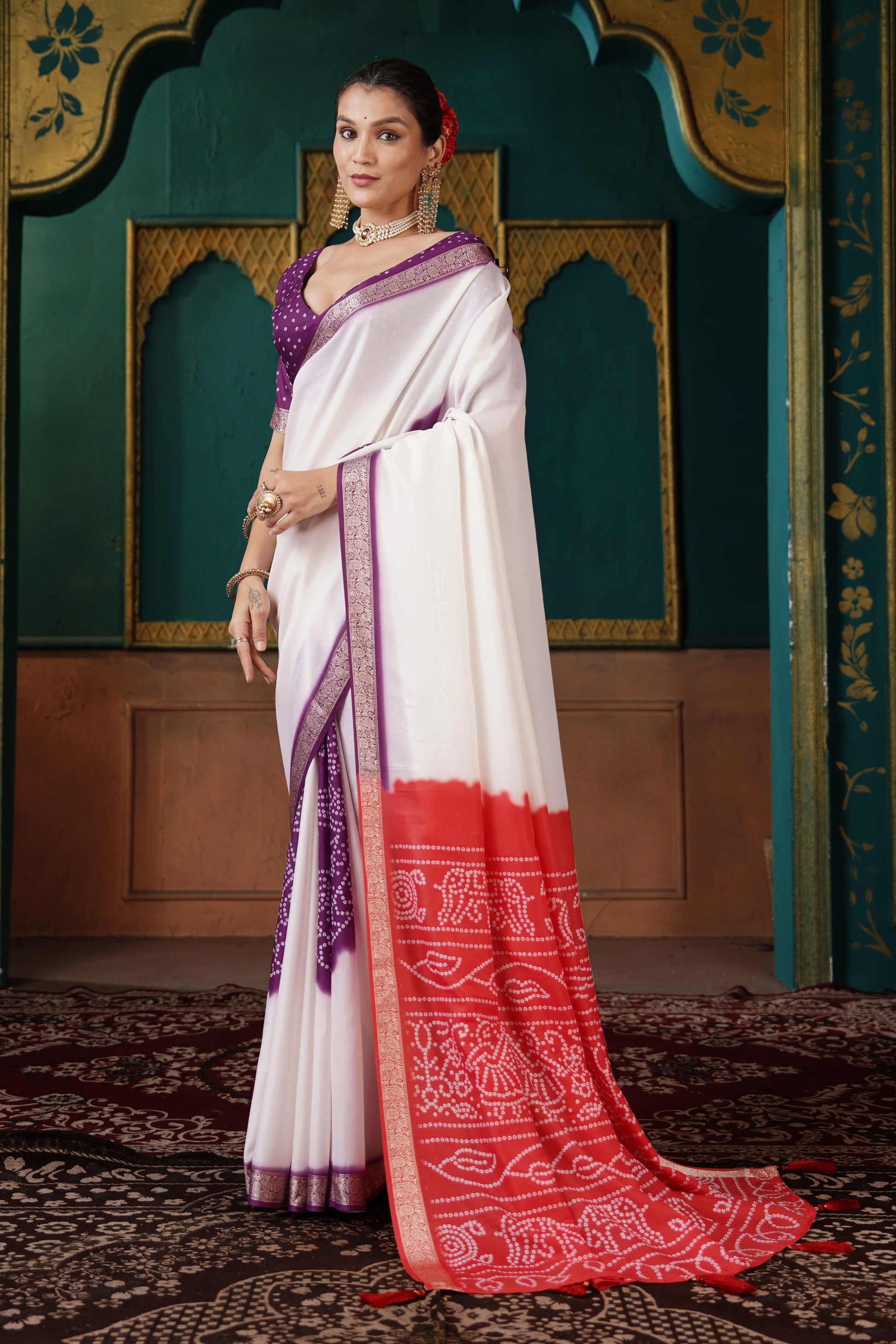 Make a bold yet sophisticated statement with the Pearl White & Vermillion Silk Saree from the Trikunti collection. This artistic garment features a pristine pearl white body, dramatically accented by a deep royal purple border that provides a majestic and modern frame. The ensemble is brilliantly completed by a vibrant vermillion red pallu, showcasing traditional white Bandhani tie-dye patterns including intricate elephant motifs and geometric ethnic designs. Finished with a slender gold zari trim, this saree is a premier choice for festive celebrations, traditional ceremonies, and elegant social gatherings.
