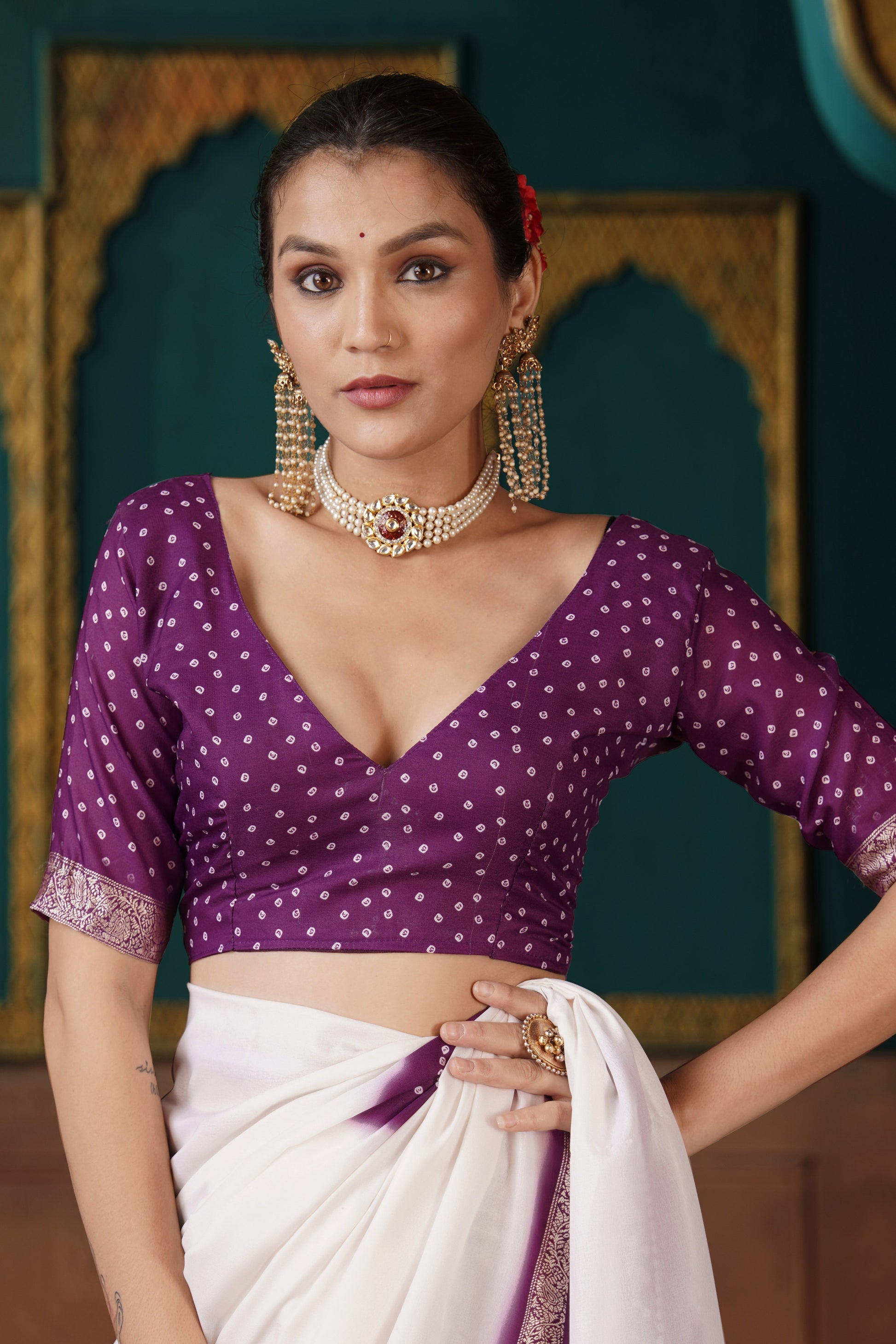 Design: Features a minimalist solid body paired with a traditional Bandhani-print pallu and a delicate gold zari border; includes a coordinated purple blouse featuring fine white Bandhani dot prints.
