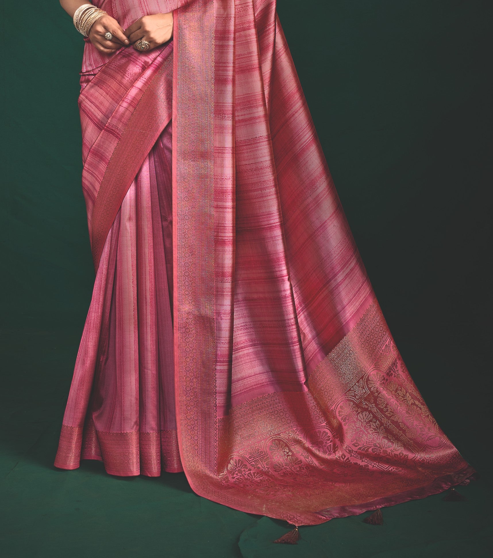 Grace any occasion with the ethereal beauty of the Rose Quartz Silk Saree from the premium Pallavi Vol. 4 collection. This sophisticated garment is crafted from high-density silk, featuring a distinctive horizontal striated texture that gives the fabric a modern, multidimensional appearance. The soft rose-pink body is exquisitely framed by a broad, shimmering blush-gold zari border and an opulent pallu detailed with traditional floral vine engravings. This saree is an exceptional choice for wedding ceremonies, high-end festive gatherings, and formal evening social events.