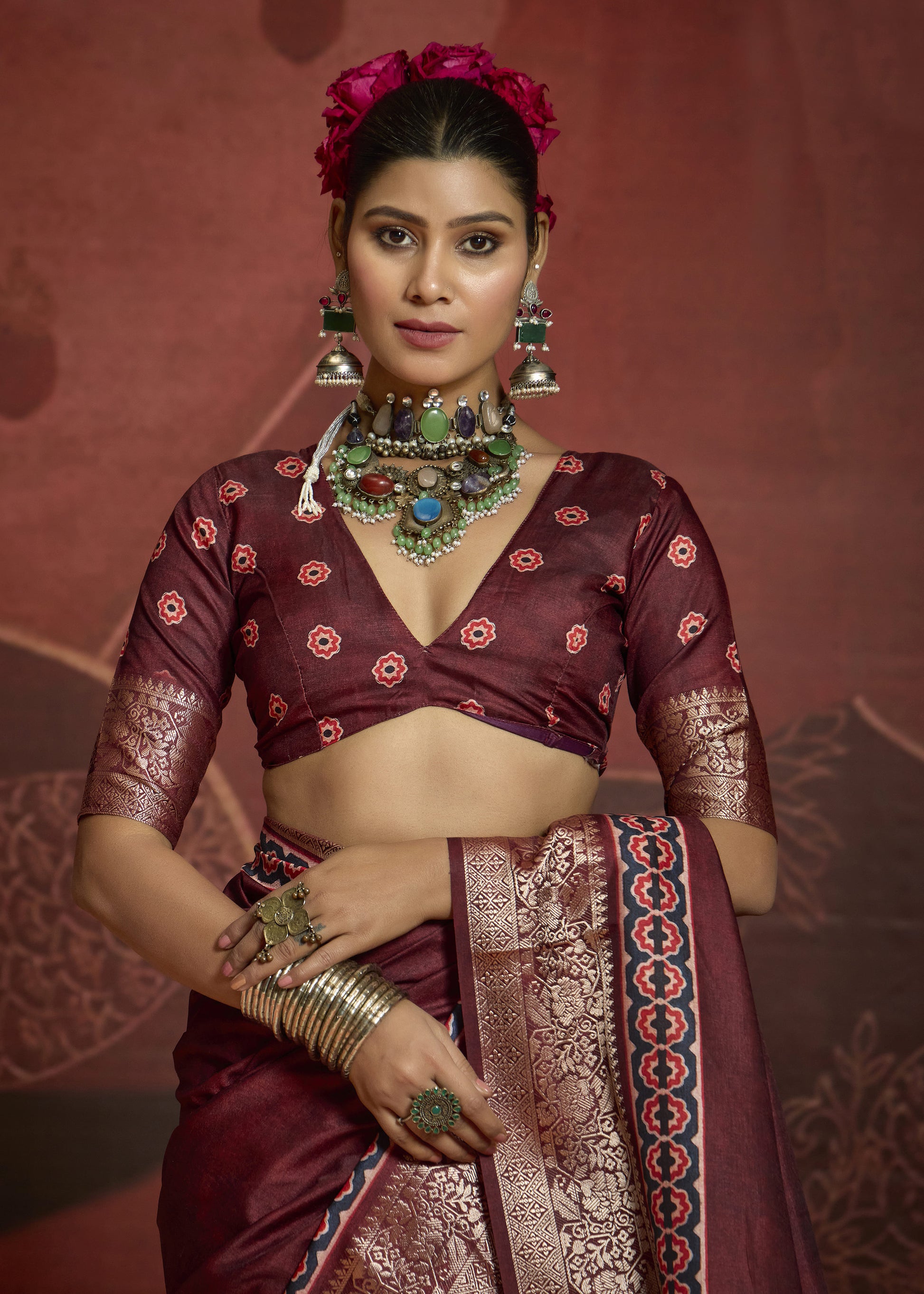 Indulge in the deep, rich tones of the Royal Amethyst Banarasi Silk saree. This luxurious piece is meticulously crafted from premium, high-density silk, offering a structured, opulent drape and a soft, luminous sheen. The solid wine-purple body provides a sophisticated, minimalist canvas that allows the grand, ornate borders to take center stage. Featuring a broad, shimmering gold zari border with intricate floral vine engravings and decorative geometric bands in black and magenta, the look is completed by a dramatic pallu showcasing traditional tiered motifs and architectural patterns. This saree is a definitive choice for royal weddings, grand receptions, and upscale festive galas.