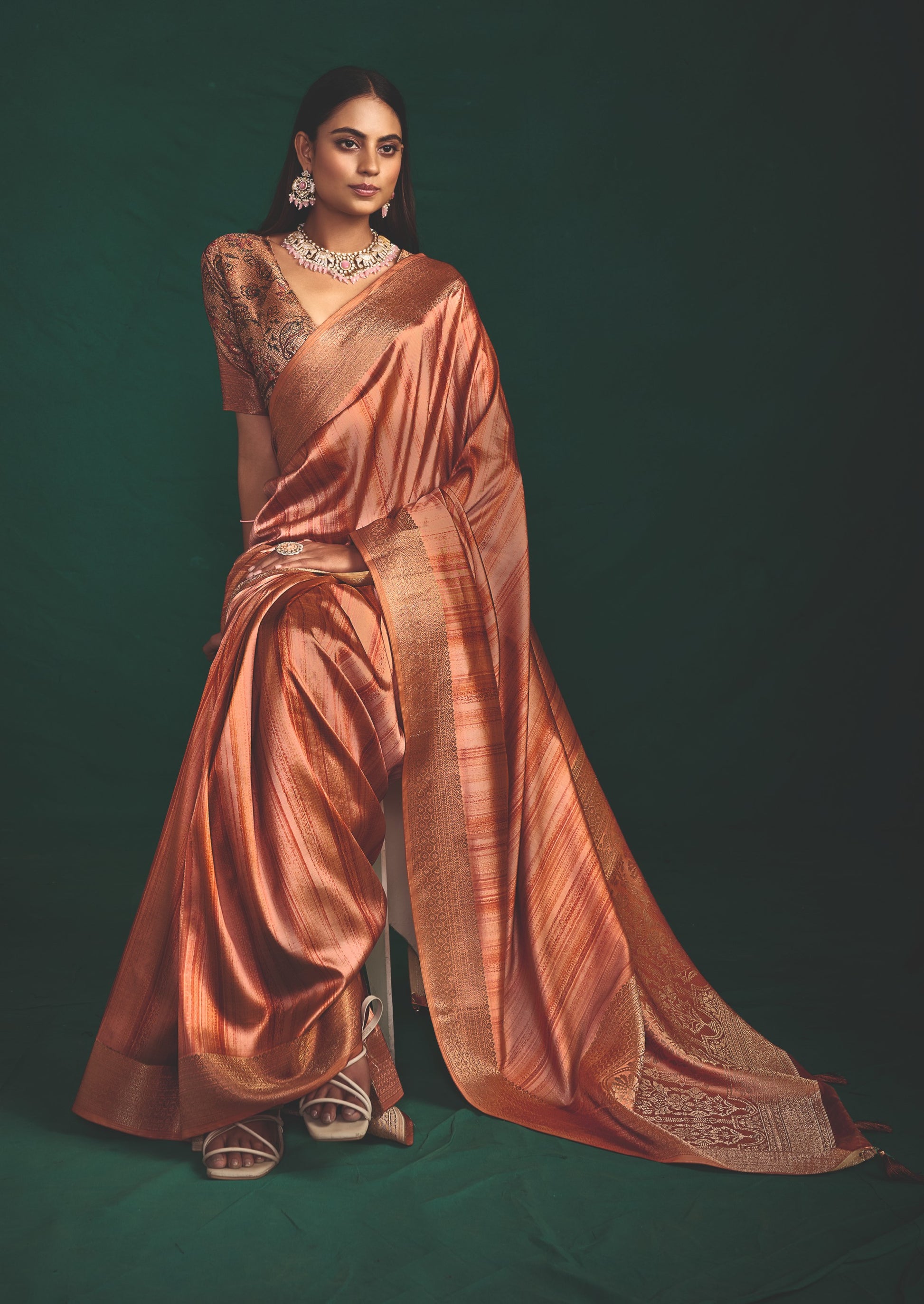 Color: A vibrant Rustic Amber Orange base with tonal striated highlights, beautifully accented by high-contrast Copper-Gold Zari work.