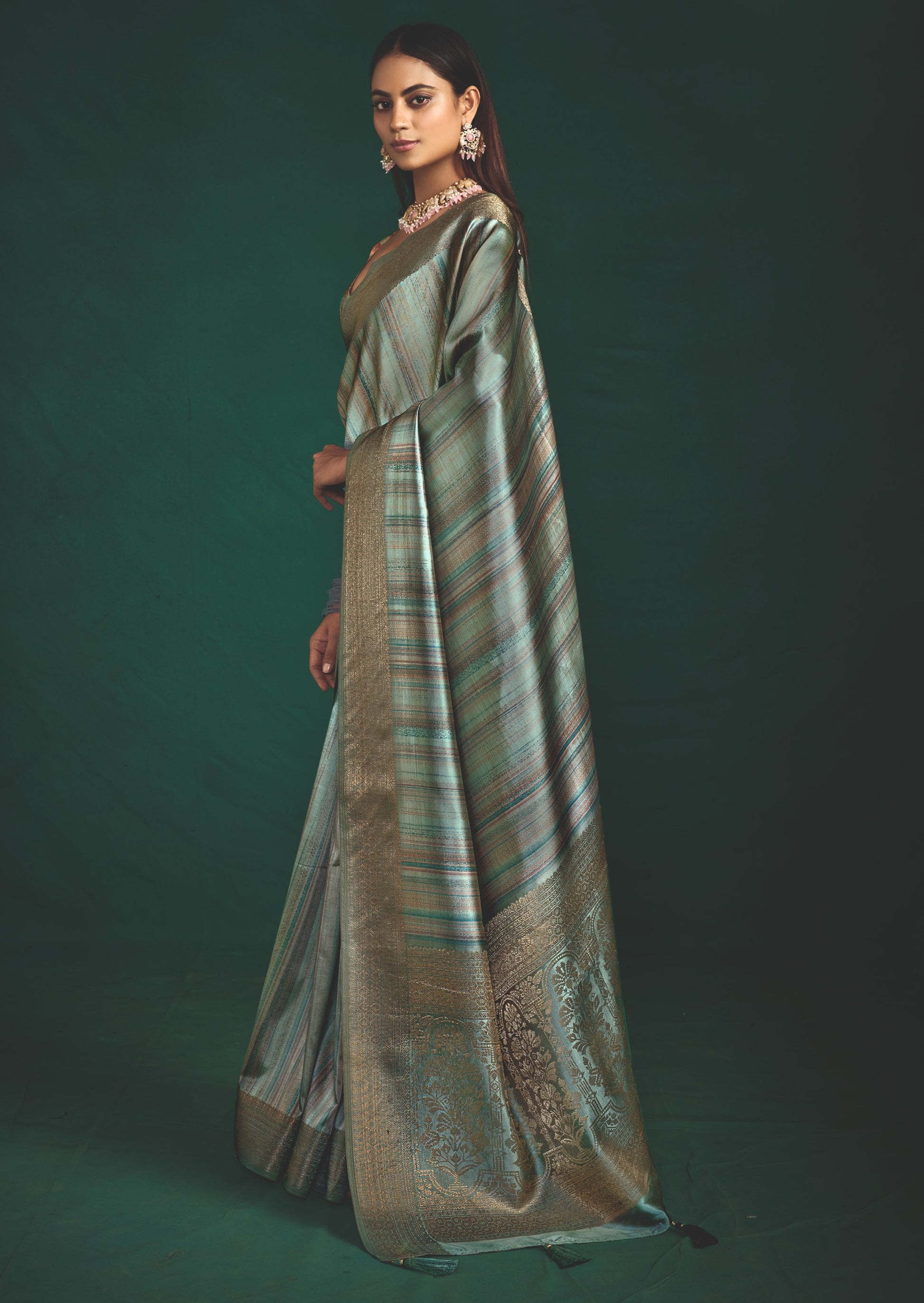 Color: A complex Silver Sage base with multi-colored striated highlights, beautifully accented by high-contrast Gold Zari work.
